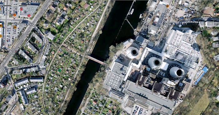 Die Kanal-Ausbuchtung oberhalb der Kabelbrücke ist der ehemalige Hafen Lichterfelde, der zu Anfang des 20. Jahrhunderts beim Bau des Teltow-Kanals mit vier ähnlichen Anlagestellen in Steglitz, Tempelhof, Mariendorf und Britz-Ost angelegt wurde. Dieser Hafen spielte bei der Standortwahl für das 1972 in Betrieb gegangene Kraftwerk eine entscheidende Rolle, denn hier konnten dann die Tankschiffe aus Westdeutschland anlegen und das Schweröl übergeben, mit dem dieses wichtige Kraftwerk zur Sicherstellung der Westberliner Strom- und Fernwärmeversorgung zunächst betrieben wurde. Eine teilweise Umstellung auf Gas erfolgte erst nach der Wiedervereinigung. Die beiden heutigen GuD-Blöcke (300 MW elektrisch und 230 MW thermisch) sind seit 2019 in Betrieb (170515). Quelle: Google Earth