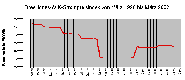 Der Wiederanstieg der Strompreise läßt sich deutlich an dem oben abgebildeten Dow Jones / VIK-Strompreisindex ablesen, mit dem der Verband der Industriellen Energie- und Kraftwirtschaft (VIK) von März 1998 bis März 2002 monatlich die Durchschnittspreise für Industriekunden ermittelte (Preisangaben pro Kilowattstunde ohne Strom- und Mehrwertsteuer):