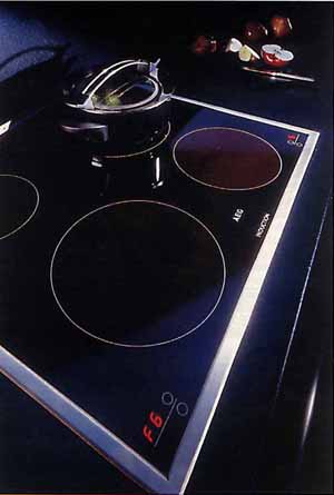 Seit 1984 gibt es Glaskeramik-Herde, die ganz ähnlich aussehen wie die soeben beschriebenen Herde mit Strahlungsheizkörpern, aber nach einem völlig anderen Prinzip funktionieren. Der Unterschied zeigt sich, sobald man die Kochzonen der Glaskeramikplatte einschaltet. Es tut sich nämlich erst mal gar nichts: Weder sieht man unter der Glaskeramikplatte irgendwelche Heizkörper glühen noch wird eine der Kochzonen warm. Daß der Herd funktioniert, merkt man erst, wenn man einen Topf darauf stellt und das darin befindliche Wasser sogar schneller zu sieden beginnt als bei anderen Herden.