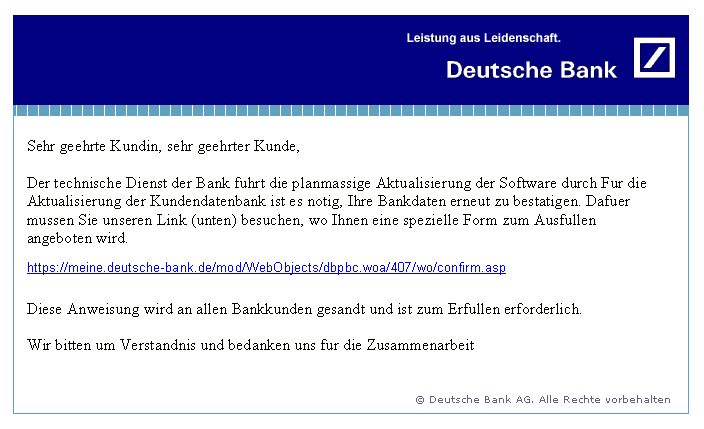 wie sie zuhauf in den gefälschten Schreiben der "Deutschen Bank"