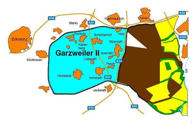 Innerhalb des Abbaugebiets Garzweiler II verschwinden mehrere Orte und müssen rund 7.600 Menschen umgesiedelt werden. In den Orten Otzenrath, Spenrath und Holz wird die Umsiedlung zur Zeit abgeschlossen. Außerdem müssen noch die Orte Immerath, Lützerath, Pesch und Borschemich geräumt werden. Der östliche und nördliche Teil der braunkohlegrube wird bis 2045 überwiegend landwirtschaftlich rekultiviert. Der im westlichen Teil gelegene Rest des Geländes soll zu einer "lebendigen Seelandschaft mit großem Freizeit- und Erholungswert für Mensch und Natur" entwickelt werden.