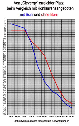 "Clevergy" hat es offenbar besonders auf Kleinstverbraucher mit einem Jahresverbrauch bis 1500 kWh abgesehen, wie dieser Vergleich anhand der Stuttgarter Postleitzahlenregion 70178 zeigt (Stand 26.3.06 / Quelle: Verivox). Aber auch in diesem Segment belegt Clevergy mit "Click & Service" bestenfalls den dritten Platz, sofern der einmalig gewährte Bonus berücksichtigt wird. Ohne Boni kommt er nur auf den sechsten. Und bei 2000 kWh beginnt dann mit und ohne Boni ein steiler Absturz auf die hinteren Plätze. Als Durchschnittswert für den Verbrauch eines 3-Personen-Haushalts gelten 3500 kWh. Ein einmalig gewährter Bonus - in der Regel verbilligt er die erste Jahresrechnung um 20 bis 60 Euro - wird von vielen Anbietern auch deshalb gewährt, um ihre Rangfolge bei der Anzeige der Ergebnisse in den Tarifrechnern zu verbessern. Die vordersten Plätze bei den Tarifrechnern belegen in der Regel solche Anbieter, die "Vorauskasse" verlangen. Angebote dieser Art blieben bei dem hier angestellten Vergleich außer Betracht.
