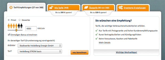 Verbraucherfreundliche Voreinstellungen fanden die Tester lediglich bei "Hauspilot", "energieverbraucherportal" und "Stromtarife". Hier gibt es aber andere Kritikpunkte, weshalb die beiden erstgenannten Anbieter lediglich mit 2,8 bzw. 2,9 bewertet wurden. Das zum "Internationalen Wirtschaftsforum Regenerative Energien" (IWR) gehörige Portal "Stromtarife" bekam sogar die Note mangelhaft (4,9), weil seine Tarifinformationen äußerst dürftig und hinzu teilweise veraltet waren.