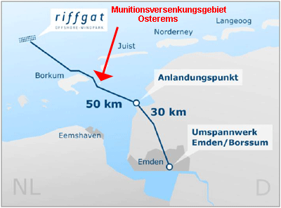 Nach dem neuesten Bund-Länder-Bericht über die "Munitionsbelastung der deutschen Meeresgewässer" wurden in den Jahren 2012 und 2013 entlang der Trasse für die Netzanbindung von Riffgat rund 30 Tonnen Munition beseitigt. Die Funde kamen nicht überraschend, da die Trasse an dem bekannten Munitionsversenkungsgebiet Osterems zwischen Borkum und Juist vorbeiführt, das auch in den amtlichen Seekarten vermerkt ist (siehe Karte). Die Munition wurde durch eine private Firma geortet, freigespült und dem Kampfmittelbeseitigungsdienst Niedersachsen (KBD) zur fachgerechten Entsorgung bzw. Sprengung übergeben. Im Gebiet Osterems sind schätzungsweise 2.000 Tonnen Minen, Granaten, Bomben, Torpedos, Panzerfäuste und Kleinmunition versenkt worden, wovon über 400 Tonnen noch auf dem Meeresgrund liegen.