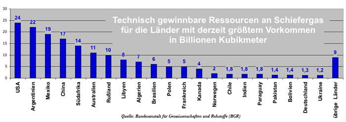 Vor allem bietet die Schiefergas-Förderung auch den USA langfristig keine Perspektive, obwohl hier weltweit die größten technisch abbaubaren Ressourcen vermutet werden (siehe Grafik 1). Nach Ansicht von Fachleuten wird sich die per Fracking geförderte Gasmenge schon aus natürlichen Gründen in Kürze wieder verringern. Der bereits vorhandene Rückgang der konventionellen Förderung, der den Schiefergas-Boom auslöste, werde dann verstärkt statt kompensiert. Die geschätzten Reserven würden ohnehin auf spekulativen Schätzungen beruhen (130311).