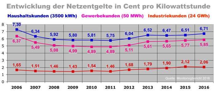 Die hier genannten Netzentgelte sind bundesweite Durchschnittswerte. In der Praxis ist die Belastung der drei Verbrauchergruppen je nach Region unterschiedlich. Bei Haushalten differieren die tatsächlich verlangten Netzentgelte um mehr als fünf Cent und bei Industriekunden um mehr als zwei Cent. Die überfällige Vereinheitlichung der Netzentgelte kommt auch mit dem jetzt vom Kabinett gebilligten "Netzentgeltmodernisierungsgesetz" nicht zustande. |