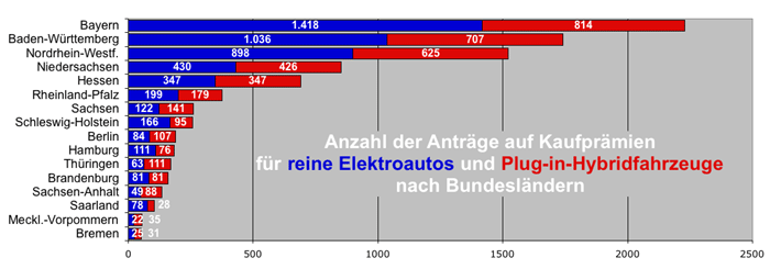 Die von der Bundesregierung im April 2016 beschlossene Kaufprämie für Elektroautos (160403) findet nur wenig Interesse. Wie das Bundesamt für Wirtschaft und Ausfuhrkontrolle (Bafa) Anfang Januar mitteilte, wurden bis Ende 2016 nur 9023 Anträge gestellt. Wenn die Nachfrage so schwach bleibt, werden bis Ende der dreijährigen Laufzeit am 30. Juni 2019 weniger als ein Zehntel der etwa 300.000 Elektrofahrzeuge zugelassen, mit denen die Bundesregierung gerechnet hatte. Entsprechend würde die auf 600 Millionen Euro begrenzte Förderung aus Bundesmitteln, die eigentlich nach dem "Windhund-Prinzip" vergeben werden sollte, größtenteils gar nicht in Anspruch genommen.