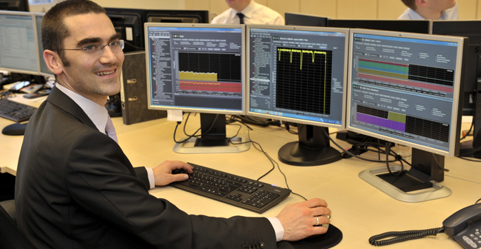 Das Geschäft mit Regelenergie ist nicht unbedingt eine Goldgrube. Diese Erfahrung machte der Kommunalkonzern Thüga, als er 2014 fünfzig Blockheizkraftwerke zu einem "virtuellen Kraftwerk" zusammenfaßte, das in drei Regelzonen sowohl Sekundärregelleistung als auch Minutenreserve anbot. Auf diesem Foto verfolgt der zuständige Projektleiter der Thüga-Tochter Syneco die Leistungsverfügbarkeit der fünfzig Anlagen in Echtzeit auf dem Bildschirm und strahlt noch voller Zuversicht. Aber schon im Lagebericht für das Geschäftsjahr 2014, den die Thüga Trading GmbH wenig später ablieferte, klang herbe Enttäuschung an: "Die Komplexität und Kleinteiligkeit verursachen hohe personelle und technische Ressourcenbindung. Der Einbruch der Regelenergiepreise erschwert das Erreichen der Wirtschaftlichkeit." Zum Jahresende 2016 zog sich die Thüga endgültig aus dem unrentablen Geschäft zurück (151115). Foto: Thüga