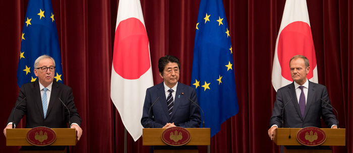 Das JEFTA-Abkommen wurde jetzt von EU-Kommissionspräsident Jean-Claude Juncker, dem japanischen Premier Shinzo Abe und dem EU-Ratspräsidenten Donald Tusk in Tokio unterzeichnet (v.l.n.r.). Es soll sich rühmlich vom Protektionismus der vertrumpten US-Politik unterscheiden. Wasserwirtschaft und NGOs kritisieren an dem neuen Freihandelsabkommen mit Japan jedoch, dass die EU-Kommission wieder mal ihren neoliberalen inneren Schweinehund nicht gezügelt und die Gelegenheit genutzt habe, um dem Zugriff privater Profitinteressen auf die Wasserversorgung Vorschub zu leisten. © EU