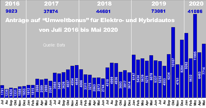 Im Rahmen ihres "Konjunktur- und Krisenbewältigungspakets" (200601) beschloss die schwarz-rote Koalition am 3. Juni, die staatlichen Prämien für die Anschaffung von Elektro- und Hybridfahrzeugen vorübergehend erneut zu erhöhen und sogar zu verdoppeln. Die Anhebung ist auf eineinhalb Jahre befristet. Außerdem soll die zehnjährige Steuerbefreiung für reine Elektrofahrzeuge bis Ende 2030 verlängert werden, die sonst Ende dieses Jahres ausgelaufen wäre (160511). Der Finanzbedarf für beide Maßnahmen wird mit 2,2 Milliarden Euro beziffert.