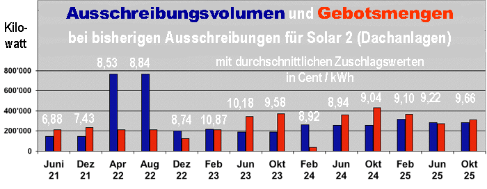 Die Bundesnetzagentur gab am 3. Dezember die Zuschläge der 14. Ausschreibung für Solaranlagen auf Gebäuden und Lärmschutzwänden zum Gebotstermin 1. Oktober 2025 bekannt (Solar 2). Bei einer ausgeschriebenen Menge von 283 MW wurden 140 Gebote mit einer Gebotsmenge von 310 MW eingereicht. Die Bundesnetzagentur musste in dieser Runde 19 Gebote mit einem Umfang von 29 MW ausschließen. Somit wurden 121 Gebote mit einem Volumen von 281 MW zum Zuschlagsverfahren zugelassen, die alle bezuschlagt werden konnten. Die Ausschreibung war damit leicht unterzeichnet.