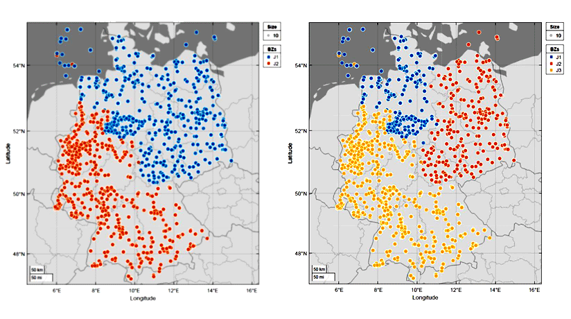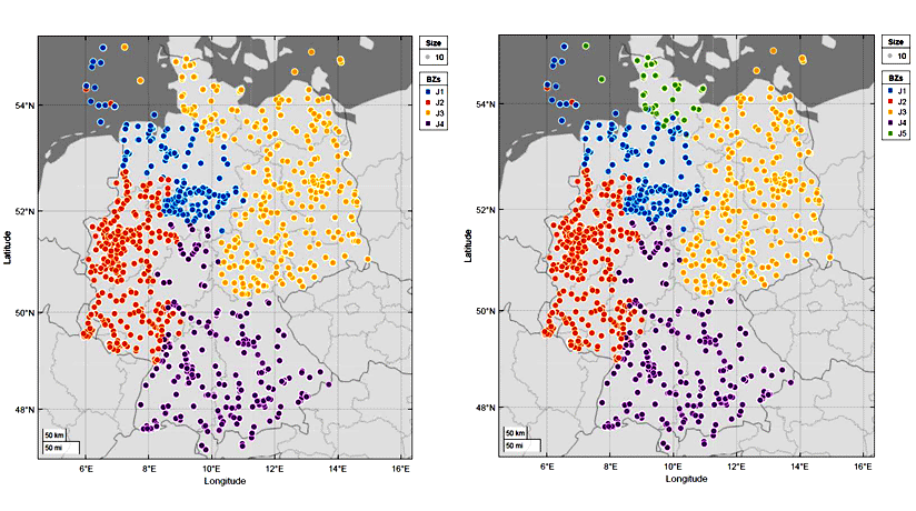 The review of bidding zones, as decided by ACER, involved comparing the status quo with four alternative configurations in the case of Germany. The configuration with five zones has now been identified as the most favorable solution. It essentially corresponds to the four-zone solution, but makes the region of Schleswig-Holstein (green dots) a separate bidding zone. The colored dots mark the network nodes that have been assigned to the respective bidding zones: