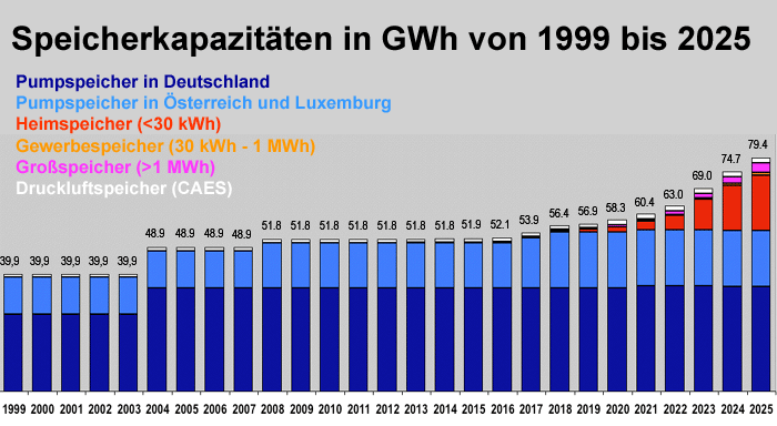 Another five years later, i.e. today, battery storage systems have caught up at lightning speed. Their total output currently amounts to around 15 GW and their total storage capacity to 23 GWh. As before, the vast majority of this is accounted for by home storage systems. Their total output has risen from 0.84 to 11.91 GW since 2020, with capacity increasing from 1.60 to 18.75 GWh. This means that they even have 2 GW more installed capacity than all pumped storage power plants (9.90 GW). In terms of capacity, however, they are still literally nowhere near matching them, as pumped storage power plants have a total of 54.58 GWh of stored kinetic energy, while the chemically stored energy of all battery storage systems combined only amounts to 23.16 GWh of electricity.
