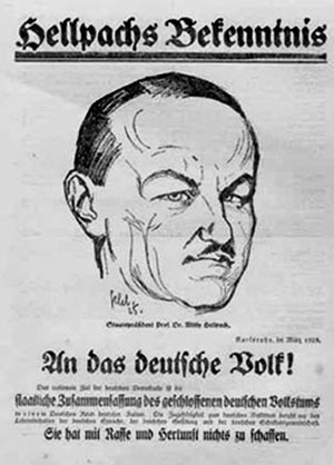 Der Vorwurf klingt zunächst plausibel, wenn man bedenkt, wieviele namhafte deutsche Wissenschaftler, Schriftsteller und Künstler sich damals in den Dienst der Kriegspropaganda stellten. Der "Aufruf an die Kulturwelt" war ein besonders markantes Beispiel für die Haltlosigkeit, mit der auch liberale Geistesgrößen plötzlich dem plattesten Chauvinismus verfielen. Tatsache ist allerdings, daß Hellpachs Name nicht unter den 93 Unterzeichnern zu finden ist, zumal ihm – im Unterschied zu etlichen geistesverwandten Unterzeichnern wie Wilhelm Wundt, Karl Lamprecht oder Friedrich Naumann – in der Tat noch die Prominenz fehlte, um in eine solche Walhalla des deutschen (Un-)Geistes aufgenommen zu werden. Möglicherweise hat man ihn mit einem entfernten Namensvetter (Gustav Hellmann) verwechselt.