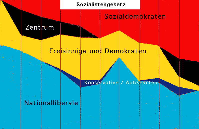 Die Fortsetzung dieser politisch-ideologischen Offensive wird 1878 durch das Sozialistengesetz unterbunden. Die Sozialdemokratie verliert ihre gesamte legale Organisation und den damit verbundenen Propagandaapparat. Das 1878 verabschiedete Sozialistengesetz ist indessen kein reiner, tyrannischer Willkürakt Bismarcks, sondern kommt mit der Billigung durch die Reichstagsmehrheit und die Nationalliberalen als Repräsentanten des Großbürgertums zustande. Bismarck schlägt damit zwei Fliegen mit einer Klappe: Er zwingt die Nationalliberalen, dem antiliberalen Sozialistengesetz zuzustimmen und sich damit zur grundsätzlichen Verbundenheit von großbürgerlichen und feudalen Klasseninteressen zu bekennen. Auf der anderen Seite eliminiert er die Arbeiterbewegung als die einzige überzeugende Kraft einer "Revolution von unten", die seine "Revolution von oben" gefährden könnte, aus dem legalen politischen Kräftefeld.